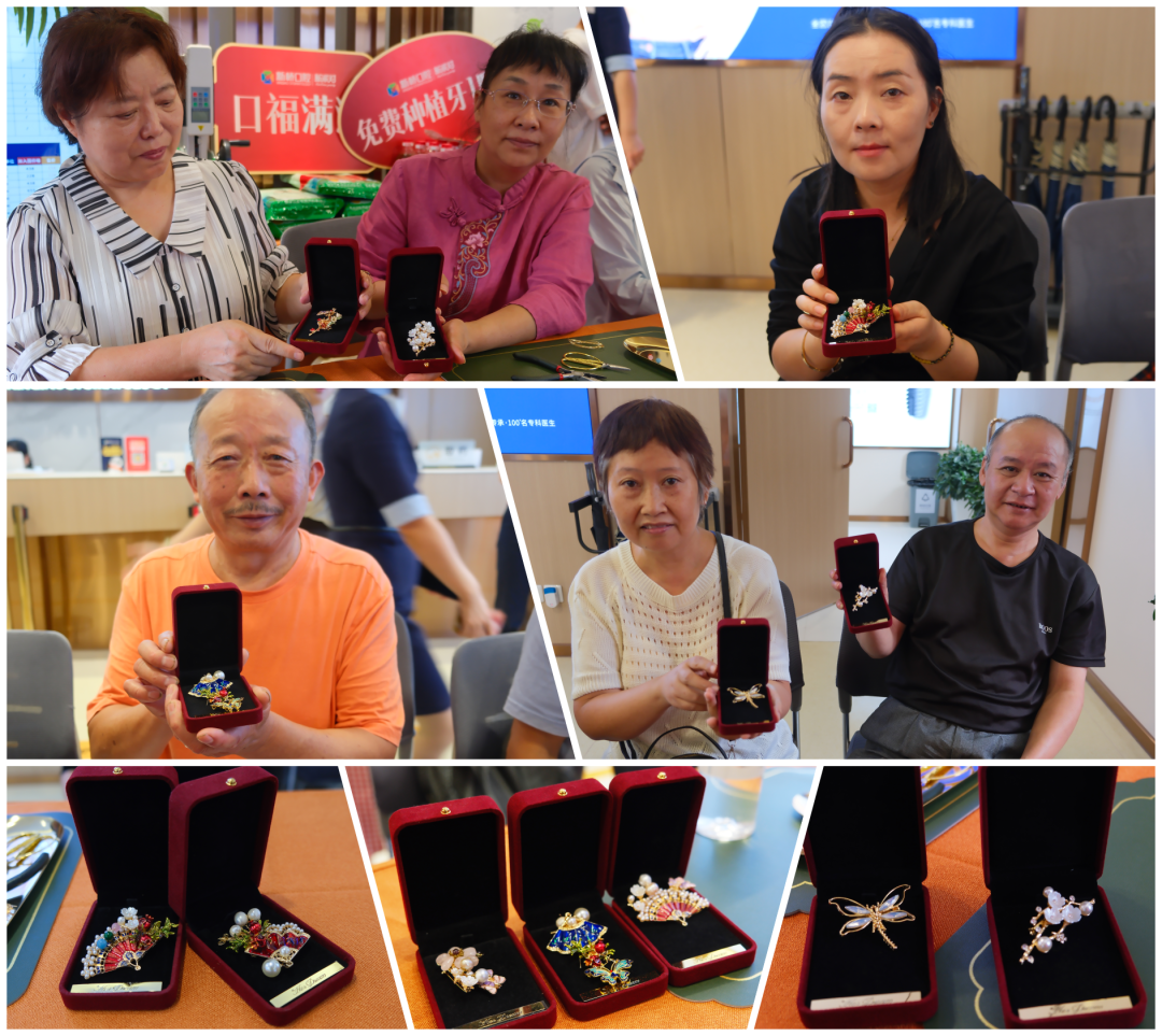 来宾们将珍珠小心地点缀到自己挑选的半成品饰品上,不同形状和美感的胸针逐渐成型,如莹润花束、如蹁跹蝴蝶、如知秋一叶,各有一番美丽与风格。