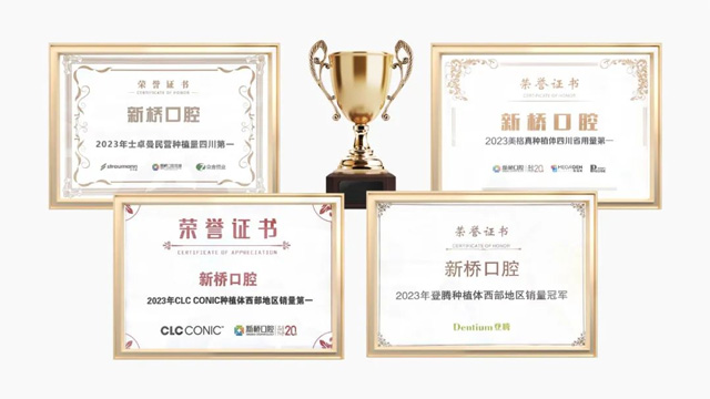 全球四大知名种植体品牌——瑞士士卓曼(ITI)、意大利CLC、韩国登腾(DENTIUM)和韩国美格真(MEGAGEN)为新桥口腔颁发“2023年种植体用量中国西部/四川第一”荣誉。