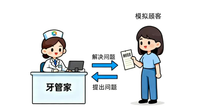 本次竞赛突破传统技能比赛框架,打造独特考核机制。各院区派出的2人小组在比赛当日承担不同角色:一人作为牙管家参赛,需接待由其他院区同事扮演的“模拟顾客”,应对各种问题,完成全流程服务;另一人则化身“模拟顾客”,前往抽取到的牙管家席位,为参赛牙管家制造各类难题,以此全面检验牙管家的专业知识面、业务能力、灵活性以及抗压能力。
