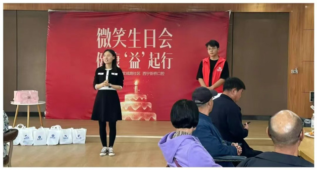 金秋送爽,丹桂飘香。在重阳佳节即将到来之际,为弘扬中华民族尊老、敬老、爱老的传统美德,新桥口腔西宁院区携手通海路街道文成路社区,在社区活动中心共同举办了一场以“微笑生日会,健康益起行”为主题的敬老庆生活动,为本月过生日的医院老患者及社区老年居民送上了一份节日的温暖与诚挚的祝福。