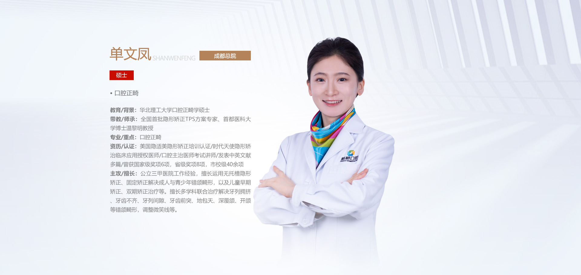 新桥口腔正畸专科和种植专科,均以接诊数、成功率及满意度领跑西部口腔专科连锁领域。新桥口腔正畸专科连续三年独享“西部地区隐形正畸冠军诊室”荣誉称号。种植专科由华西种植专家、四川省口腔医学会口腔种植专委会副主任委员刘果生、常委李华领衔学科建设,被原华西医科大学卫生部口腔种植科技中心授牌“微创牙种植技术推广应用项目示范单位”。