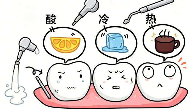 补牙时磨除龋坏组织,会导致牙齿内部的牙本质小管暴露,牙本质小管里有神经末梢,打磨后它会变得更敏感,遇到冷热刺激就会产生酸痛感。